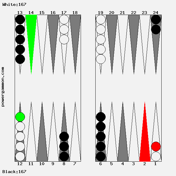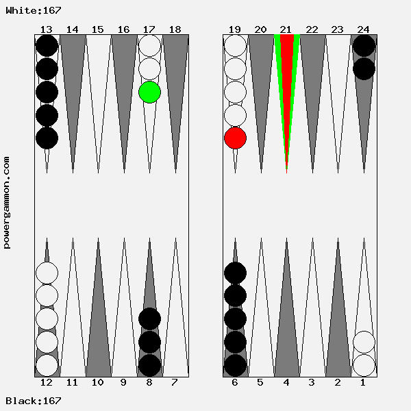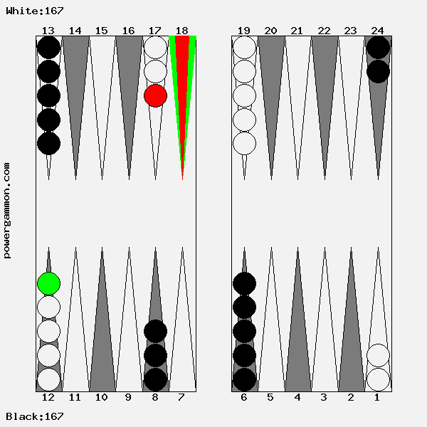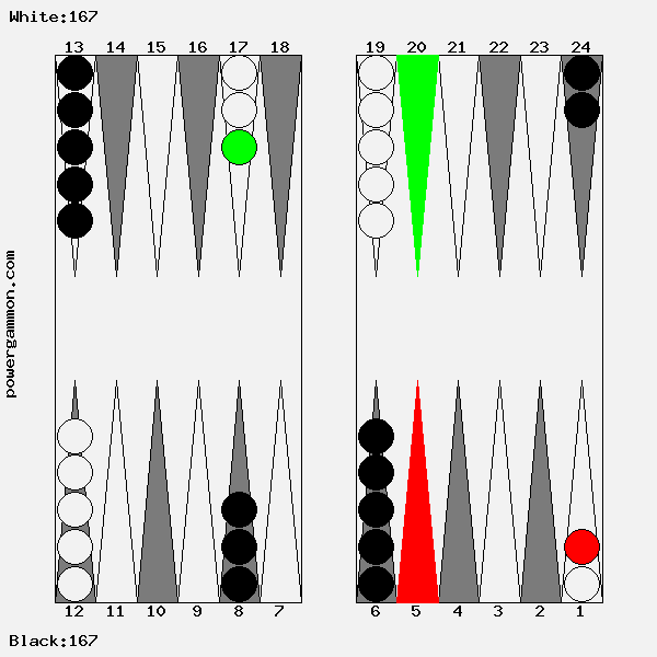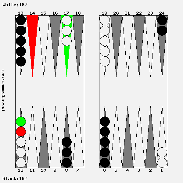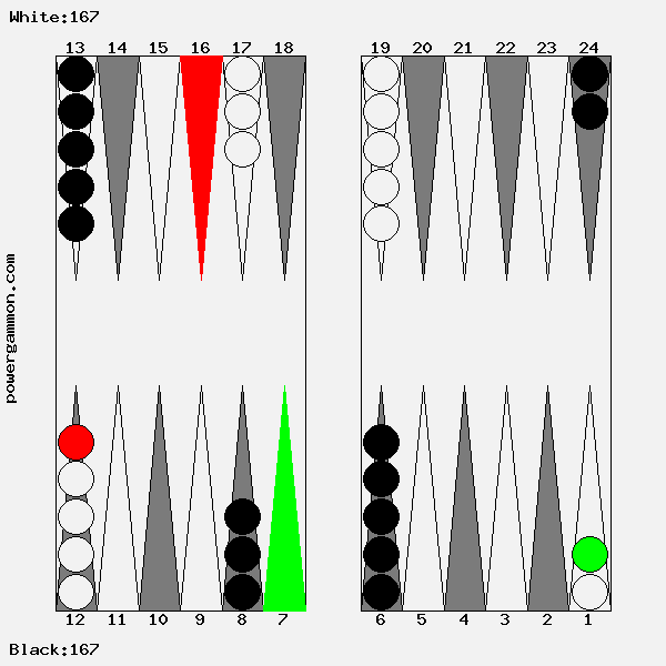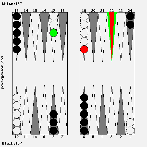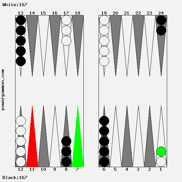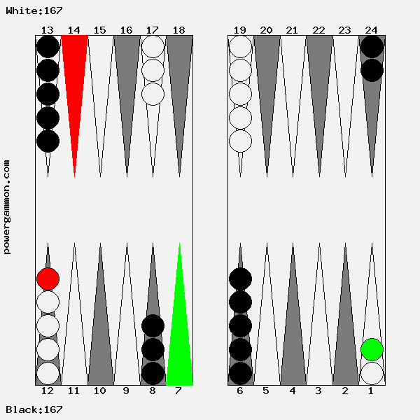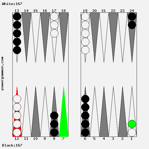 Mit einer 62 sollte Weiß versuchen das Ziel einer Blockade und das des Errichten eines fortgeschrittenen Ankers zu kombinieren. Der richtige Zug lautet 1->7, 12->14. Mit 12->14 wird ein Stein in den dritten Quadranten gebracht welcher zur späteren Blockadebildung benutzt werden kann. Mit 1->7 wird einer der beiden Runner voran bewegt. Selbst wenn er, und das ist gar nicht so unwahrscheinlich, auf Point 7 geschlagen wird, so hat Weiß im nächsten Zug diverse Möglichkeiten entweder den Angreifer selbst zu schlagen oder aber einen fortgeschrittenen Anker im ersten Quadranten zu bilden.