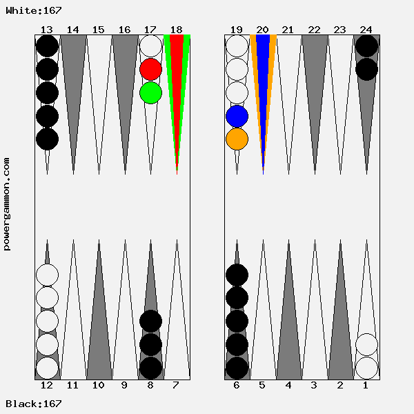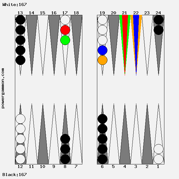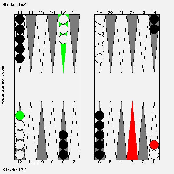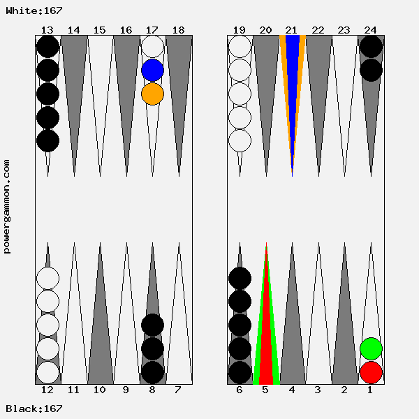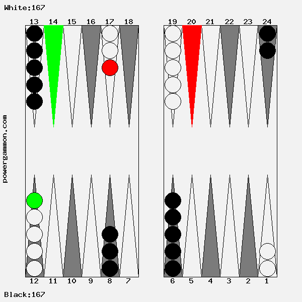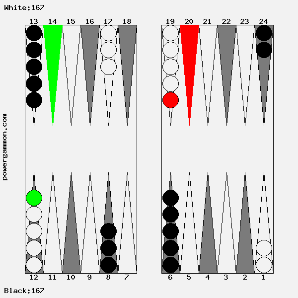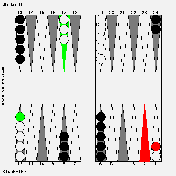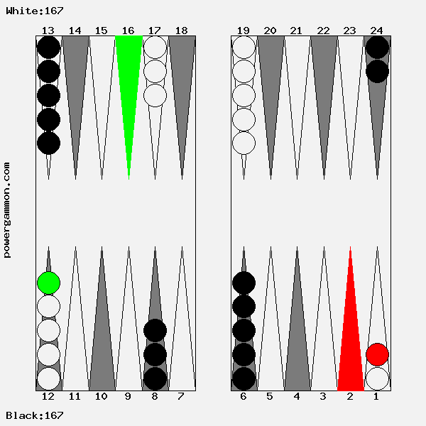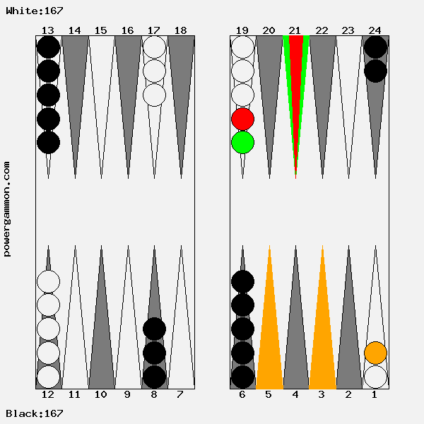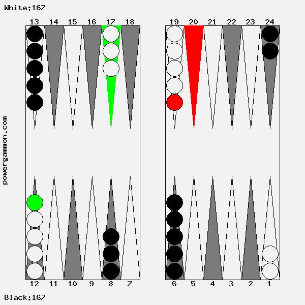Mit einer 62 sollte Weiß versuchen das Ziel einer Blockade und das des Errichten eines fortgeschrittenen Ankers zu kombinieren. Der richtige Zug lautet 1->7, 12->14. Mit 12->14 wird ein Stein in den dritten Quadranten gebracht welcher zur späteren Blockadebildung benutzt werden kann. Mit 1->7 wird einer der beiden Runner voran bewegt. Selbst wenn er, und das ist gar nicht so unwahrscheinlich, auf Point 7 geschlagen wird, so hat Weiß im nächsten Zug diverse Möglichkeiten entweder den Angreifer selbst zu schlagen oder aber einen fortgeschrittenen Anker im ersten Quadranten zu bilden.