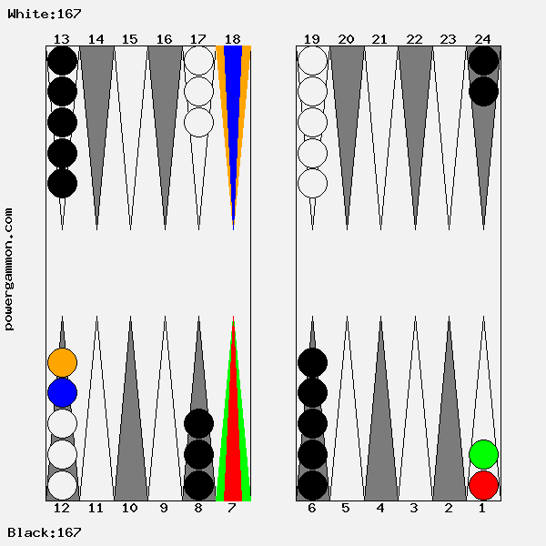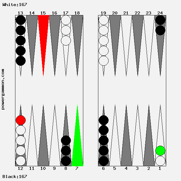 Fehlerhaft wäre z.B. 1->9, da im Falle des Verlustes unseres Steines dieser nicht nur wieder von vorn anfangen müßte, sondern Rot auch ohne Risiko einen Builder für seine eigene Blockade bekäme. Zuletzt soll geklärt werden, warum es nicht sinnvoll ist, einen Stein auf den Point 7 zu setzten. Es existieren diverse Würfelkombinationen mit denen Rot diesen Stein schlagen kann. Gelänge ihm dies, hätte Weiß auf einmal drei Runner im Gegensatz zu Schwarz welcher weiterhin nur zwei hätte.