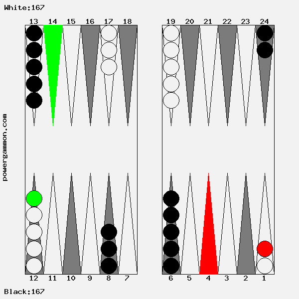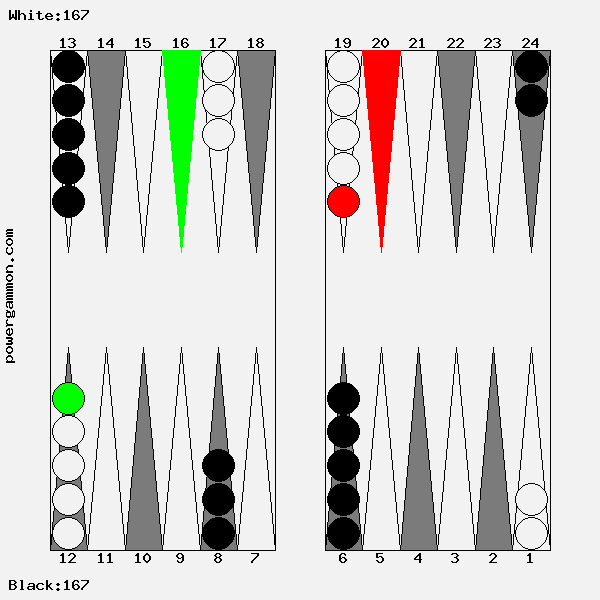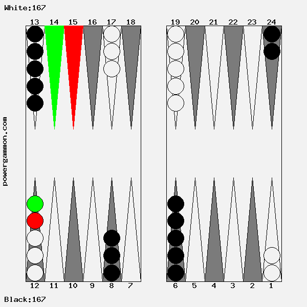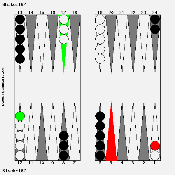 65 ist ein sehr starker Eröffnungswurf. Er ermöglicht es uns, direkt einen unserer Runner in Sicherheit zu bringen. Dies ist ein nicht unerheblicher Vorteil. Deshalb spielen wir 1->12. Erstens hat Weiß jetzt nur noch einen Runner anstatt wie Schwarz zwei, und zweitens ist ein zusätzlicher Stein in die Schlacht geführt worden, welcher beim Aufbau der Blockade helfen kann. Der Nachteil, nicht direkt ankern zu können und den verbliebenen Runner schutzlos zurück zulassen, ist mehr als kompensiert. Sollte Schwarz den verbliebenen Runner schlagen, läuft er Gefahr selbst geschlagen zu werden und dann drei Runner zu haben anstelle des einen Weißen. Außerdem hat weiß, falls ihm im Verlaufe des Spiels ein Stein geschlagen wird, immer noch die Chance einen Anker zu bilden.
